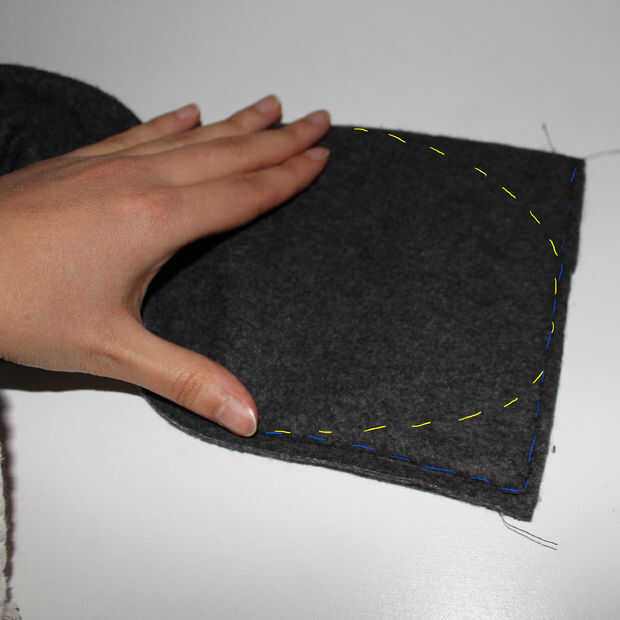 4. en los extremos de la bufanda, o puede coser un borde cuadrado (mostrado por las líneas punteadas azules), o como prefiero, un borde redondeado (mostrado por las líneas punteadas amarillas). El borde redondeado hace extremos de su bufanda se parecen más a una manopla.