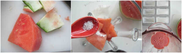 2. Si la sandía no es lo suficientemente dulce, puede agregar azúcar. La mía es muy dulce ya, tan sólo hay que poner un poquito de sal en la sandía. (Sal añadir su profundidad de sabor y llevar a cabo la dulzura)