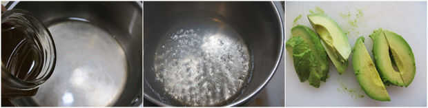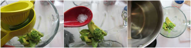2. poner el aguacate en el mezclador, apriete en el zumo de limón y añadir una pequeña cantidad de sal. Luego añadir el almíbar que hiciste.