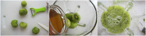 2. poner el resto de los kiwis en la batidora, añadir miel o azúcar y añadir el zumo de manzana.