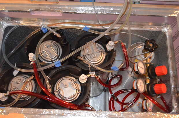 Si usted está planeando llenar este kegerator con su propia cerveza, recomiendo usar 4 x 5 galones barriles Cornelius. Estos barriles se ajusta perfectamente dentro del congelador de 7,0 pies cúbicos que compré en Menards. Además la plataforma sobre la compresor del congelador funciona perfecto para el tanque de CO2. (Verás que tengo 2 tanques de CO2, pero es porque estaba actualizando desde un depósito de 5 libras a 10 libras. Es necesario el 1 tanque.