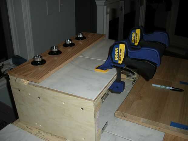 A continuación vamos a colocar la placa de ajuste. Se trata de 6" por lo que va debajo de las luces y los esconde de la vista pero crea una iluminación de los azulejos. Taladré un agujero desde dentro de la torre para ejecutar el cable de alimentación a la parte posterior y no tenerlo visible.