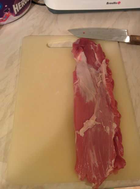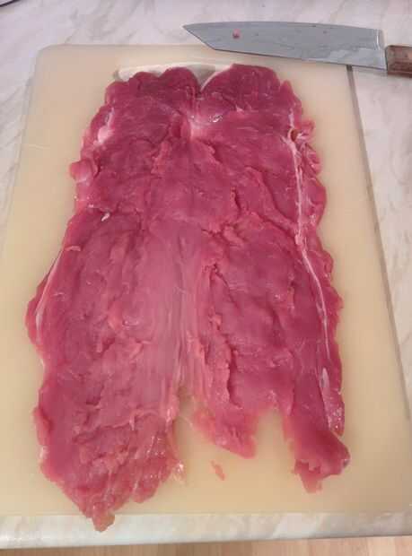 A continuación, cubrir la carne en film transparente y obtener tenderising! Usar un carne mazo/balanceo pin/cualquier otra cosa tienes ahí de plano la carne a aproximadamente la mitad un cm. de espesor y tardará más en cocinarse, más delgado y será más difícil para envolver sin desgarro pero no dude en experimentar!