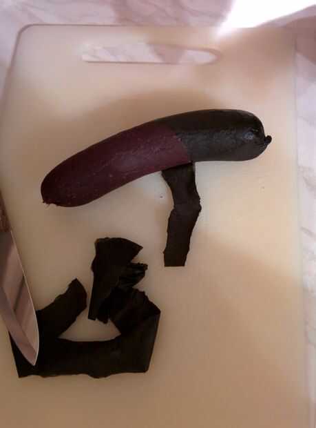 Luego ahuecar un canal para las salchichas precocidas a reposar dos mitades. Dependiendo de la morcilla que comprar puede caber salchichas de 1,5 a 3 en cada mitad.