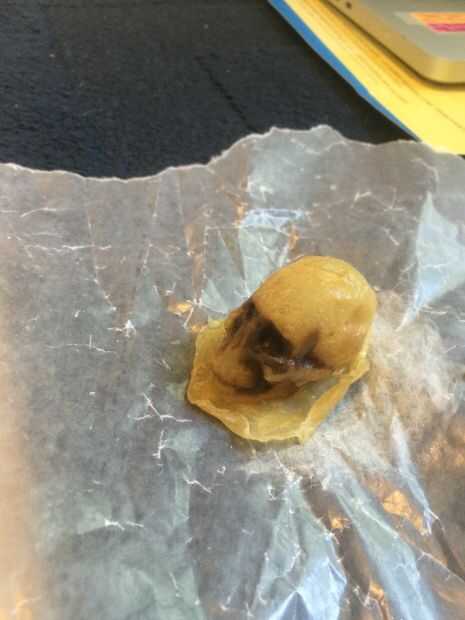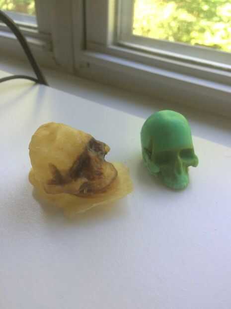 Para hacer mi réplica, coloca el molde con el abierto hacia arriba en la parte inferior de un vaso de plástico. Tuve que colocar las aletas de la parte inferior del molde a los lados de la taza para que la forma de cabeza de la calavera no estaba deformada por descansando sobre la superficie inferior de la Copa.