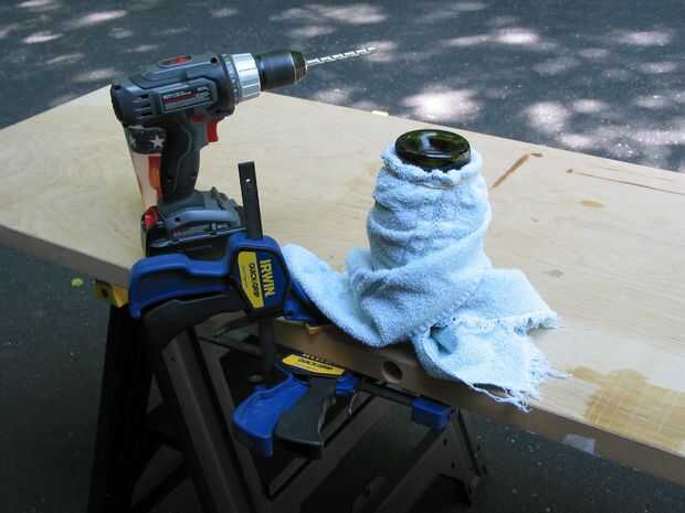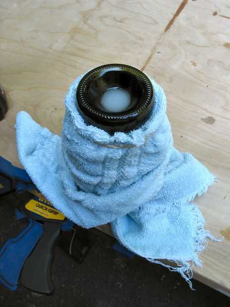 Foto #1: Envolver la botella en una toalla y fíjela a la superficie de trabajo (pinzas son de gran ayuda). Tratando de mantenerlo constante cuando la perforación podría ser peligrosa. Necesitará ser creativo un poco decidir qué funciona mejor para su situación. Sería más fácil fijar la botella horizontalmente si usted no puede calcular hacia fuera una manera de hacerlo verticalmente. Como se muestra en la imagen el cuello de la botella pasa a través de un orificio en la superficie de trabajo y se fija con dos grapas.