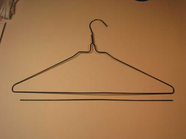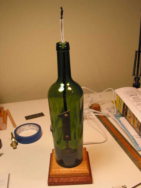 - El cable de alimentación a través de la botella desde la parte inferior de la base de los pescados. Esto es donde un pedazo de percha viene muy bien. Después de cortar aparte la percha con un cortador de alambre, cinta el extremo del cable de alimentación al cable y a través de pescado a la tapa de la botella de vino (también puede pasar la percha la botella primero, fije el cable de alimentación a la percha y luego páselo a través de la botella).