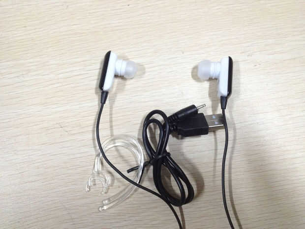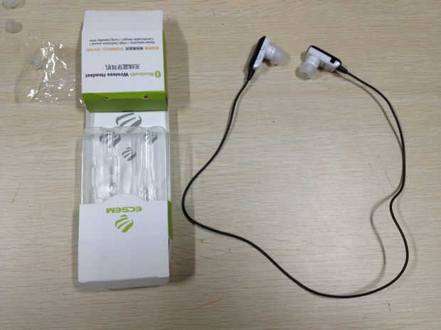 Unbox los audífonos Ecsem fuera del paquete. Podemos ver un cargador USB, auriculares, un par de oreja y tapones para los oídos.