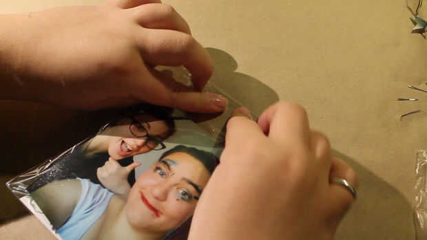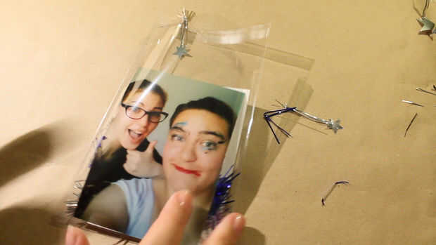 1) tome una bolsa de plástico, llenarlo con cualquier cosa que te gusta: relleno, dulces, pequeños obsequios y agregar fotos.