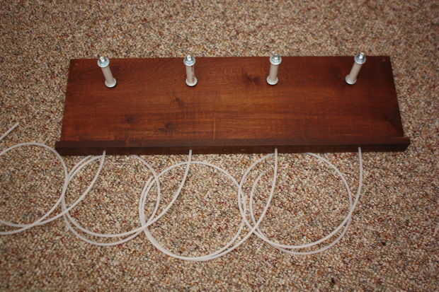 Final pegamento uno de la línea de agua dentro de los orificios que ha perforado anterior (cuadro 1) dejando alrededor de 1 mm que se pega por el lado de la madera de los pernos de carruaje de allí frente a. Esto permitirá que su filamento para mantenerse limpio y evitar frotar la madera.