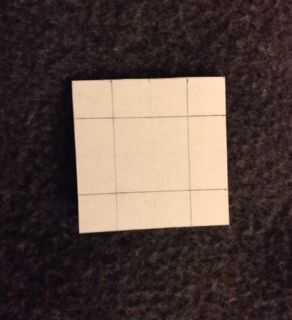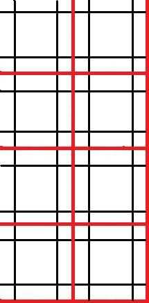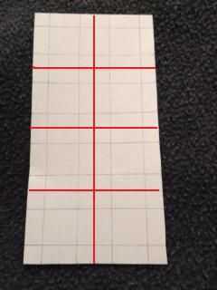 En otro pedazo de papel, marcar puntos en 1cm, 3cm, 4cm, 5cm, 7cm, 8cm en la parte superior e inferior y conectar los puntos correspondientes para hacer líneas verticales. Luego marque de 1cm, 3cm, 4cm, 5cm, 7cm, 8cm, 9cm, 11cm, 12cm, 13cm, 15cm, 16cm en los lados izquierdo y derecho del papel y conecte los puntos correspondientes para hacer líneas horizontales. Corte a lo largo de las líneas rojas gruesas para obtener plazas 8 4 x 4 cm.