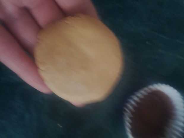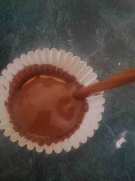 Tomar las tazas de chocolate del congelador. Tomar unas 2-3 cucharadas de la pasta de cacahuete. Rodar en una bola. Aplanar un lugar del disco (frisby wheeee!) dentro de la taza del chocolate. Cubrir con el chocolate restante. Remolino con palillos para una cobertura uniforme. Congelar (casi hora de comer!)