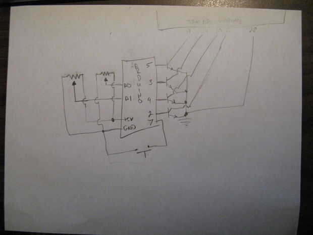 El Arduino pins (2,3,4 y 5) cada uno van a una base y emisor va a tierra.