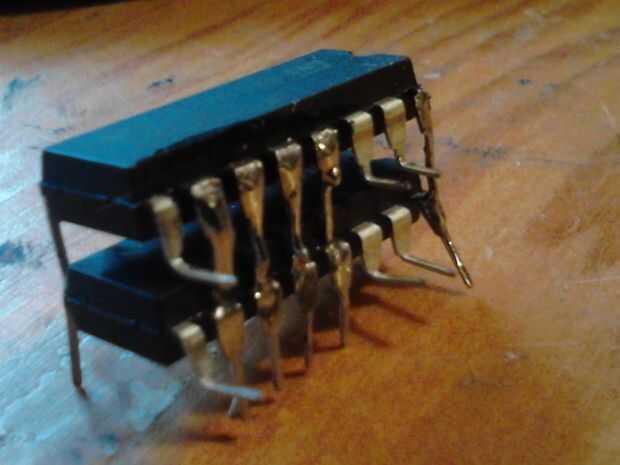 Aquí puede ver las fichas apiladas. En lugar de juntarlos firmemente, dejé un poco de espacio, por lo que el calor puede escapar si calientan. La soldadura de los pernos (que no se están pegando), a los pernos por debajo de ellos. Si la soldadura tus fichas en un tablero, necesita saltar un montón de huellas de un chip a otro. (como había descrito en el paso anterior sobre preparando sus fichas)