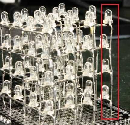 Este paso es un poco difícil. Mejor le coloque el LED como la dirección mostrada en la imagen luego suelde cada capa juntos (soldadura del ánodo de capa diferentes junto. Nosotros lo llamamos columna. Cada columna tenga un IO a control).  De esta manera, será fácil a la columna en el centro de la soldadura.