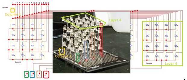 El cubo de LED 4 x 4 x 4 tiene un total de 16 transistores se utilizan para cambiar las columnas de Led y luego otro total de 4 líneas para activar o desactivar la capa de tierra. Así que un total de 16 + 4 = 20 líneas se necesitan para hacer el cubo de LED 4 x 4 x 4 de trabajo. Es importante que las capas de 4 tierra conmutada amazónicos les stwich una capa a la vez y swicthe led deseado de la capa de la trashumancia.
