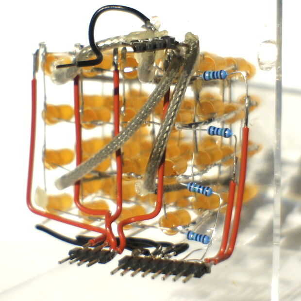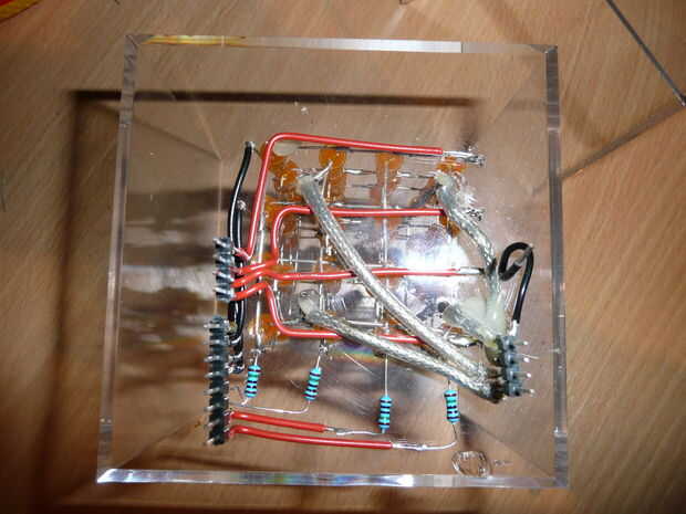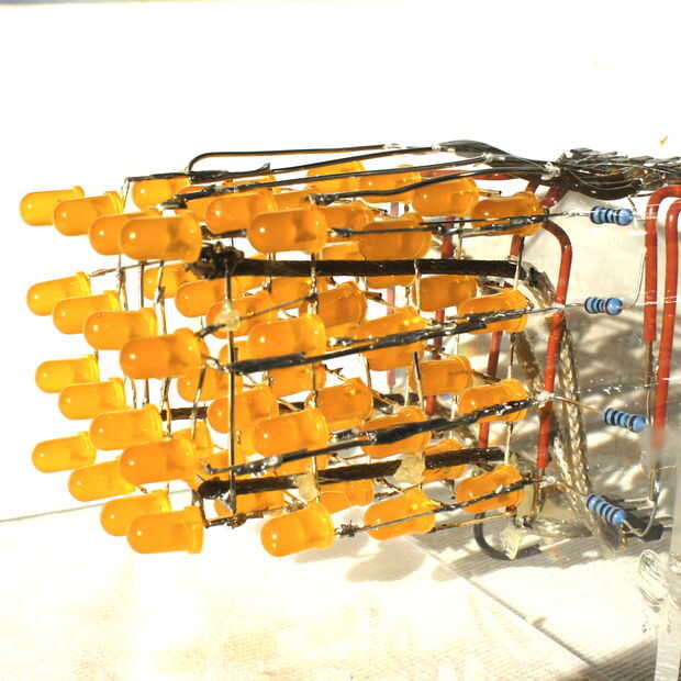 A través los cuatro restantes los agujeros que pegan las cuatro resistencias que serán soldadas a los cátodos de la primera capa. (Tenga cuidado de no derretir el plástico con su soldador, como hice yo) Estas resistencias se destinarán a cuatro cabeceras entrar en puertos 0-1-2-3 en el Arduino.