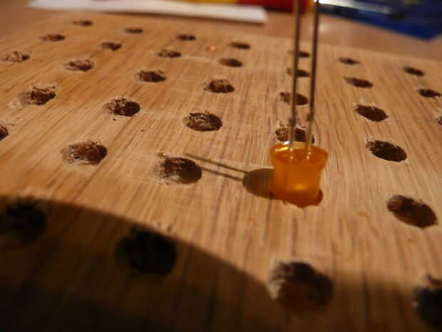 Dibujar en un trozo de madera una cuadrícula con las líneas de 12,5 mm aparte. (12 o 13 o lo que también va a hacer, pero lo hice 12,5) Dibuje al menos 4 líneas horizontalmente y 4 líneas verticalmente. (Lo hice más, porque nunca sabes qué planes voy a tener en el futuro) Ahora tienes 16 cruces. Perfore unos agujeros de 5 mm (si tus LEDs son de 5 mm) en los cruces de las líneas. Si usted Taladre orificios pequeños, la ubicación de los agujeros será probablemente más exacta.