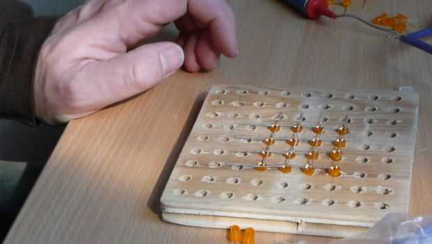 Cuando menos 16 LED tiene las piernas dobladas (plomos), puede colocarlos en su plataforma. Tienes 4 filas de patas largas (ánodo) tocan y 4 hileras de patas cortas (cátodo) tocar. En algunos lugares, los ánodos también tocará los cátodos cuando se cruzan entre sí. No es un problema. Vamos a resolver más adelante.