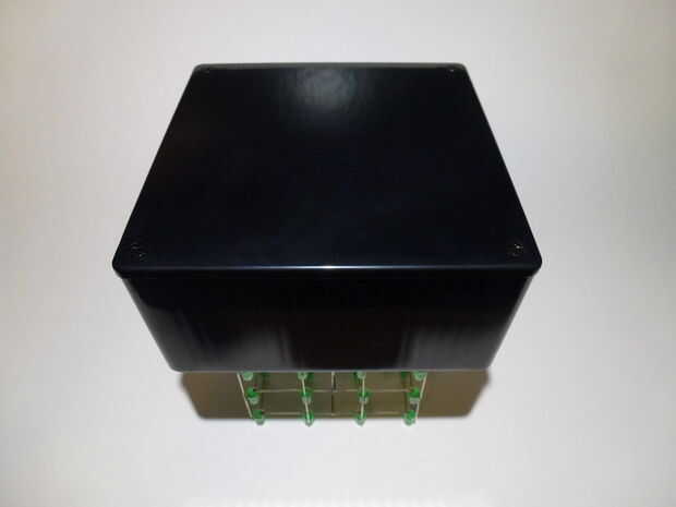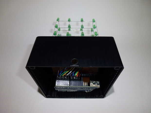 Tome el interruptor deslizante y cortar las lengüetas de montaje con las tijeras de alambre en los alicates de punta. A continuación, corte y pele los cables de positivo de la fuente de alimentación y el interruptor en los cables positivos de la soldadura. Perfore un agujero en el lado de la caja del proyecto con una broca de 5/16 bit. No se olvide de trabajar hasta el orificio de 5/16" en incrementos de tamaños de brocas. Tallar a las costillas de plástico en el interior de la caja cerca del agujero con un cuchillo, luego pegamento el interruptor en su lugar. A continuación, enchufe que los encabezados de pin y el 9v fuente de alimentación en el Arduino Uno. Por último, subir el code(sketch) a Arduino y apriete la tapa inferior en el cuadro de proyecto. Finalmente es terminado el 4 x 4 x 4 cubo del LED!