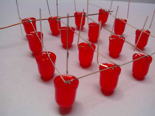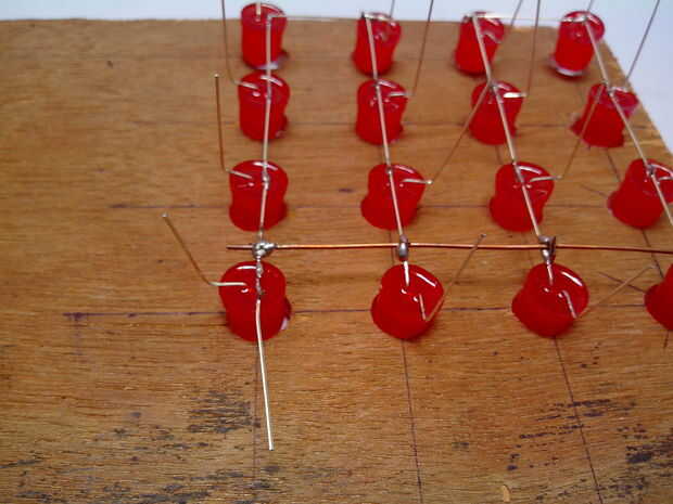 Empiece por colocar los LEDs en los agujeros y ver si los terminales de llegar a la siguiente LED. Ahora tienes que iniciar una capa de soldadura, todos los cátodos están conectados juntos en cada capa. Ser cuidado completo mientras que para soldar para soldar los terminales demasiado largo causa hará que el LED fusible hacia fuera. Sólo los cátodos que usted necesita para la soldadura dejan los ánodos para más adelante.
