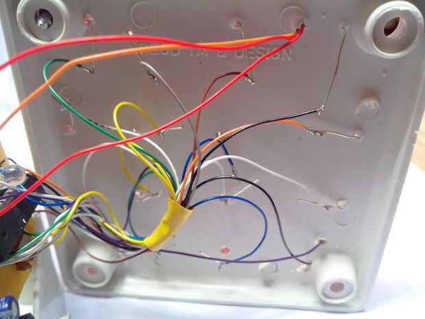Una vez que los agujeros son perforados y el cubo está pegado con la tapa de la caja de la soldadura de los terminales de los ánodos y cátodos. Utilizando cables de colores diferentes le ayudará en el seguimiento de lo LED.