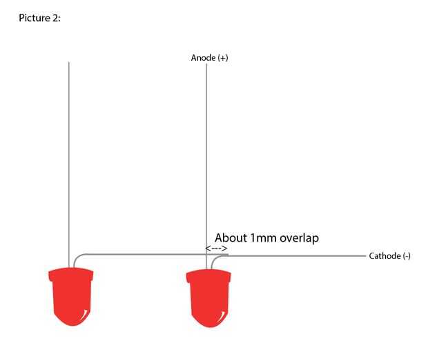 Después de hacer 16 marcas para representar que cada LED se vaya. Luego realizar un extra 4 marcas en un extremo de la red. Estas marcas extras será donde conectamos los cátodos comunes de cada capa en el Arduino. (Cuadro 1) Una buena cosa para recordar cuando marcando sus puntos es que el cátodo (pierna más corta y carga negativa) de cada LED deberá superponerse con la otra. Eso significa que el espaciado entre cada LED necesita para tener en cuenta. (Foto 2) Por ejemplo, si cada pierna cátodo mide unos 23 mm cuando el doblado restar 1mm de espacio cada de mis agujeros hacia fuera y por 22mm por lo que habría una superposición de 1mm.