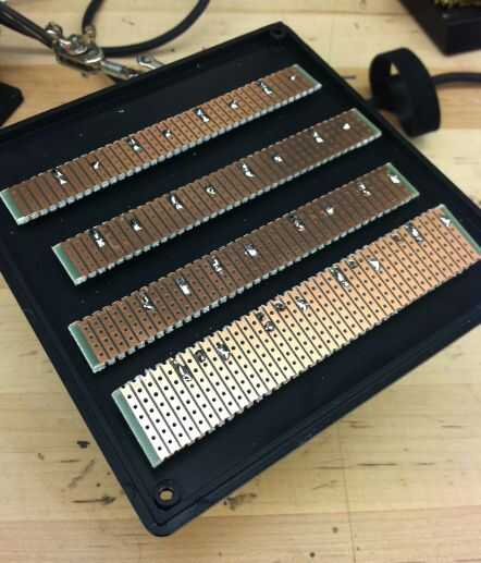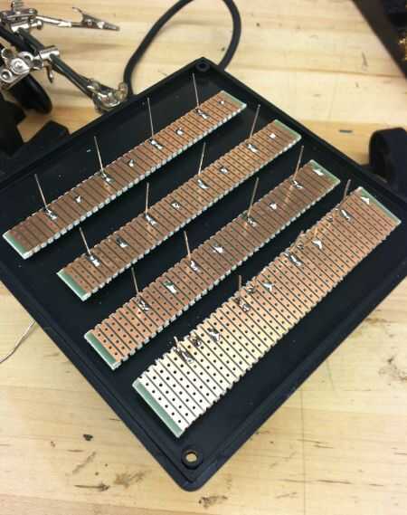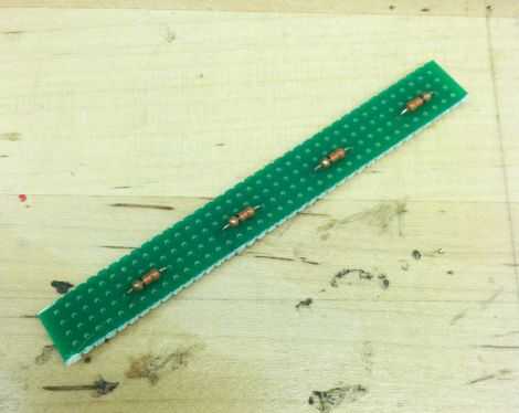 Ahora debe tener 4 tiras de placa perforada y 4 resistencias en cada tablero. Corte las patas restantes de cada resistor.