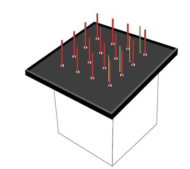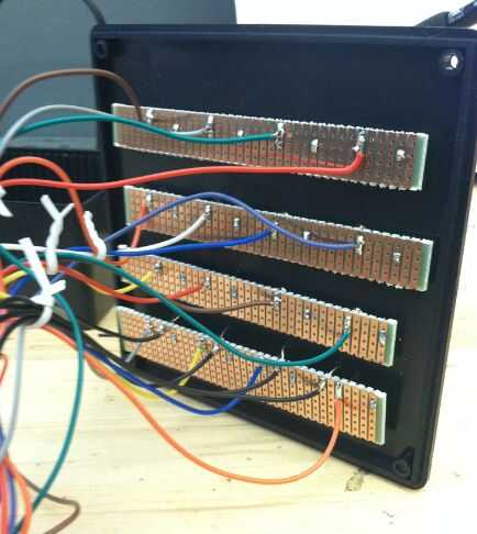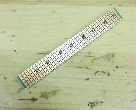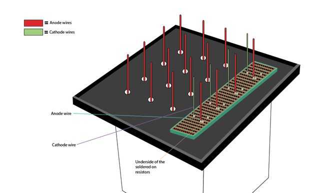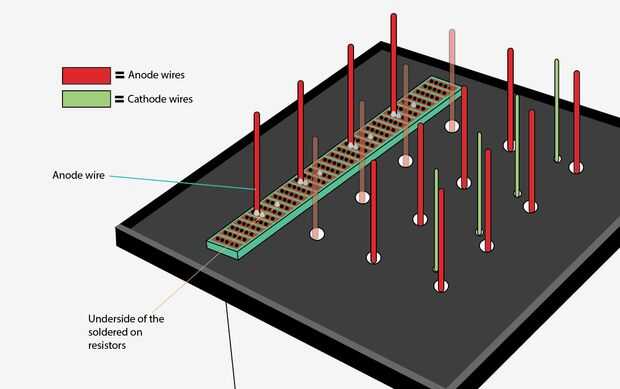 A continuación, coloque una placa perforada en el cubo y soldar las patas 4 ánodo a él. (Cuadro 6 y 7) Repita este paso para cada tarjeta! Para la Junta que tiene las piernas de cátodo común que también se asoman a través de él sólo la soldadura las piernas a cualquier columna en blanco en su placa perforada. No necesitan conectarse en las piernas de ánodo y columnas de resistencia. (Cuadro 8)
