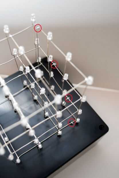 Después de tener 4 tiras de estaño 4 resistencias en cada uno de ellos. (Imagen 3 y 4) Coloca cada tira sobre mi cubo primero para marcar donde cada pata asomó a través así que mis resistencias encajaría perfectamente con cada pierna del ánodo. Las piernas de cátodo no necesita resistencias! Repita este paso para cada tira.