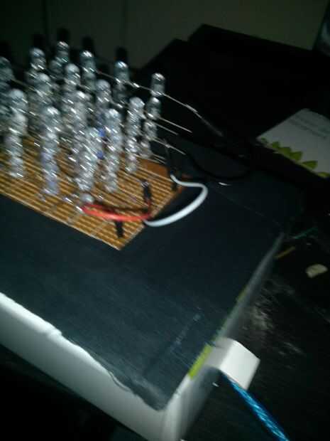 todos los pines positivo en tablero de perf. las cuatro capas ahora necesitan estar conectado así. Conecte un cable de cada pin del lado a una resistencia. soldadura de 16 cables de puente a cada pin positivo