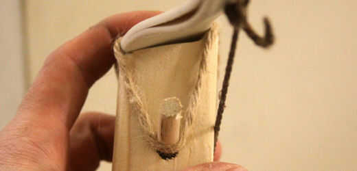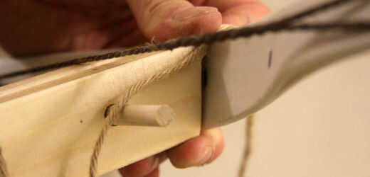 Inicio de amarre la proa a la acción poniendo al final (10 pulgadas) de su hilo en el pasador y el resto pasa por el arco. Su guita debe ser por lo menos 4 pies de largo si no más.