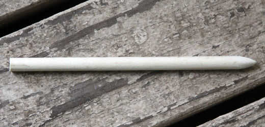 Hay seis pulgadas tornillos de plástico y aluminio que pueden adquirirse en línea bastante económica y quienes trabajan en esta ballesta. Si eres como yo y plan sólo en cajas de tiro y blancos fáciles para la diversión, un simple perno de madera funciona muy bien. Comienza por cortar 6" pieza de una espiga de 5/16". La espiga debe ser bastante recto, grano recto y libre de nudos. A continuación, utilice un afilador de cuchillo o un lápiz para crear un punto y redondo ligeramente con papel de lija.