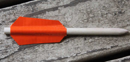 Simplemente tome dos tiras de cinta para ductos 2 y 1/2" de largo y sandwich el pasador con ellos, a partir 1/4 de final. Una vez que se alisa la cinta hacia abajo, cortar un ángulo de 45 grados en las cuatro esquinas con un par de tijeras. Terminar las paletas por el corte en un ángulo ligero de atrás al frente y viola! Tienes un buen poco perno de destino.