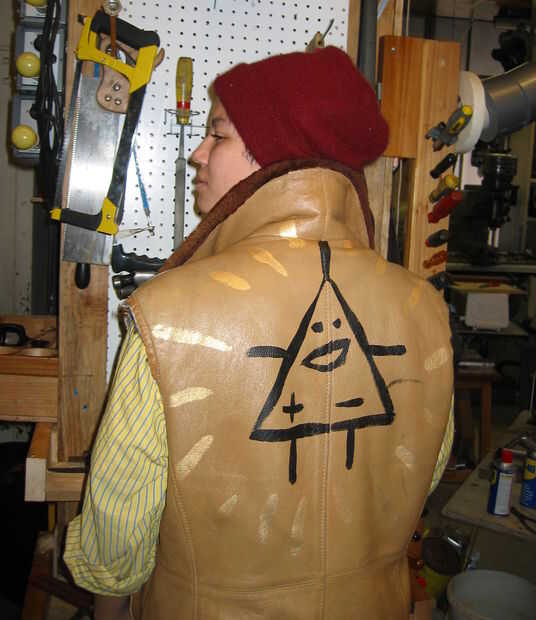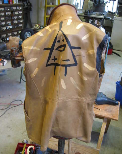 Cortamos los brazos fuera de ella para convertirla en un chaleco y hacer polainas. Entonces hemos adelgazado algunos pintura acrílica "Negro de Marte" til era acuosa y pintó uno de los personajes de dibujos animados de op-amp de la estrella en ella. La pintura para el resplandor de oro ya era lo suficientemente delgada como para utilizar directamente.