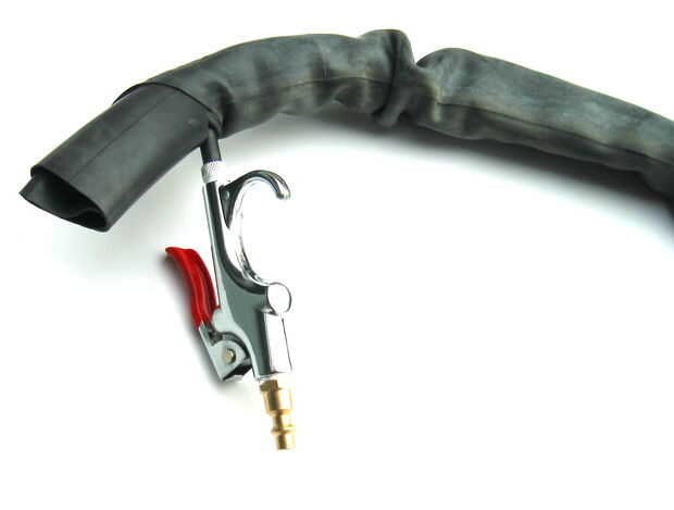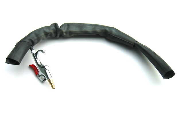 Sujete el tubo sobre la cresta del cuello y me inclina la palanca de la pistola de aire contra la mesa para presurizar el tubo.
