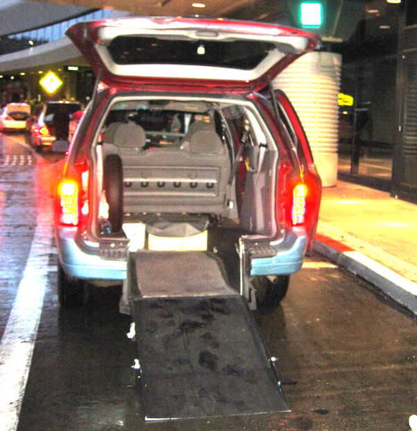 Esta camioneta mini modificado para requisitos particulares para sillas de ruedas. La rampa tiene la parte central del parachoques y la parte del cuerpo pegado a la parte inferior. Cuando está cerrado no puede decir que hay algo extraño sobre la furgoneta.