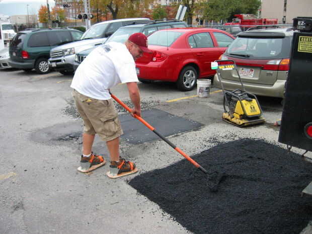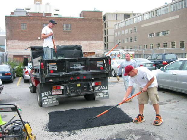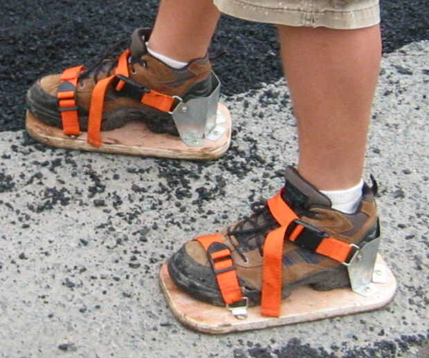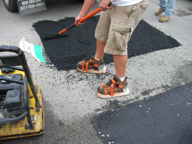 Rick Tardy stomps tar en un estacionamiento MIT con sus zapatos de asfalto de madera tradicional.