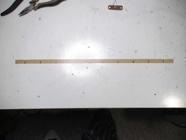 Yo será la construcción de un espejo infinito de 16 "x 16". Así que estoy empezando con 16" largo pedazo de Junta de perf. He marcado donde los LEDs van a ir. Deben alinearse con holesof las paredes internas del espejo infinito, por lo que deben ser espaciados uniformemente. El espacio a bordo del perf es una conveniente 0,1" por agujero. Tan 10 agujeros es 1".