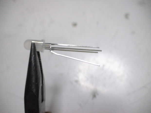 -Coge otro LED RGB y una vez más doblar el cable de tierra a un 90deg, pero hacerlo en la dirección opuesta que hizo en la primera. Así los pernos R-G-B quede alineado con el primer LED. Entonces curva paralela a las otras tres clavijas.