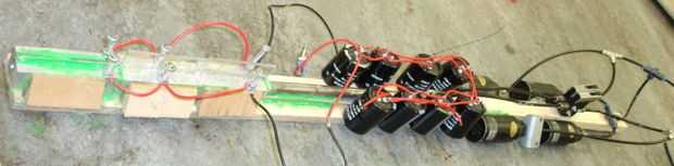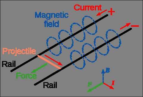 La railgun es una forma de acelerador lineal, mediante una fuerza electromagnética a multifunc un objeto. La manera en que funcionan es que se lleva a cabo una corriente eléctrica por un carril, a través del proyectil y luego por el otro carril (ver imagen). Esto se llama la fuerza de Lorenz.