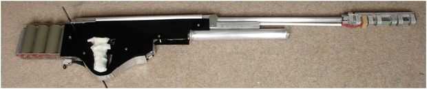 No es muy limpio, pero no tengo mucho tiempo ya que sólo estaba destinado a ser una forma alternativa de construir una pistola de airsoft con un nuevo sistema (parte de mi proyecto GCSE). Mi diseño disparó rodamientos de bolas de acero de 9mm, que es divertido, pero puede causar lesiones.