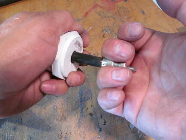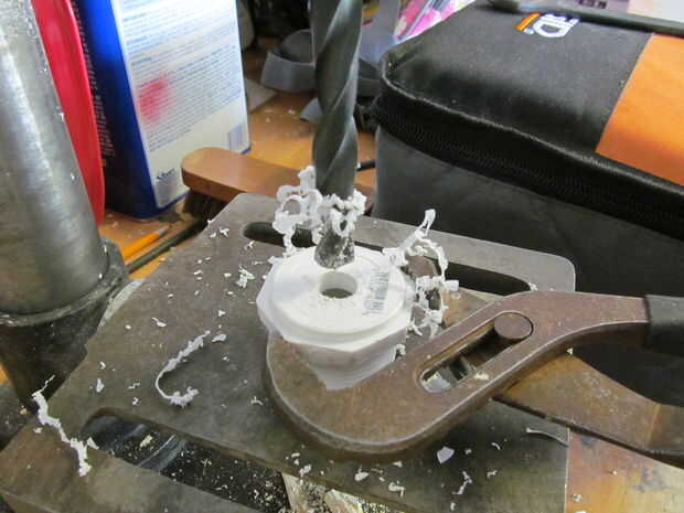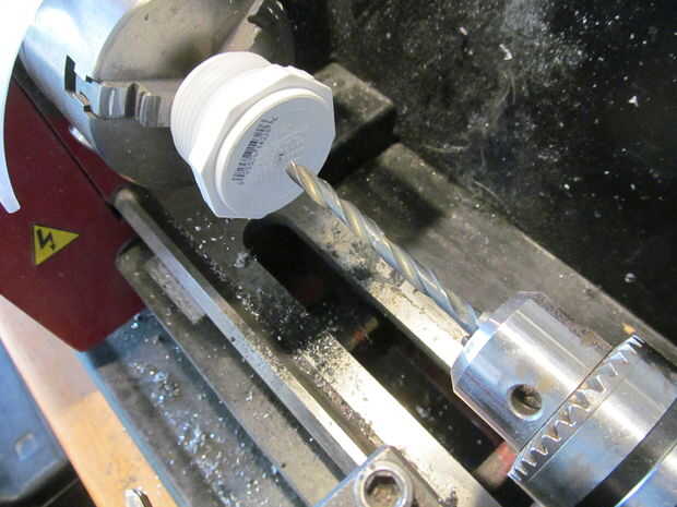 Comencé por taladrar un agujero piloto con la tapa montada en mi torno. A partir de ahí me trasladé al taladro y taladrarlo hacia fuera con una 1/2" broca. Utilicé papel de lija para facilitar los bordes del agujero.