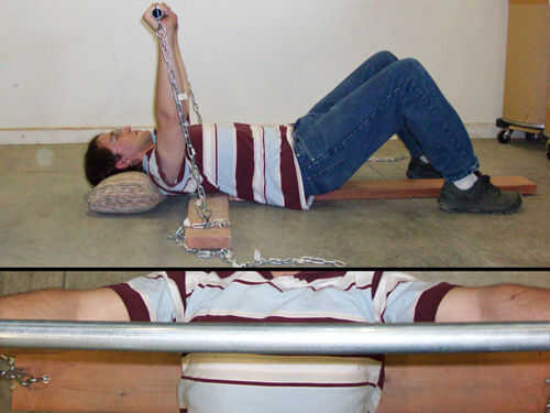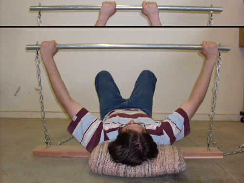 Primer lugar la 2 º Junta y almohada en su lugar como se describe en el paso 8. Ahora colocar ontop de todo, la placa base debe descansar en el fondo a un poco debajo de los omóplatos. Trate de levantar suavemente para tener una idea de donde está más cómodo. La cabeza debe descansar sobre la almohada. Ahora pulsa el estrecho para arriba de su pecho, los codos deben estar ligeramente flexionados.