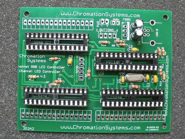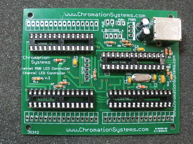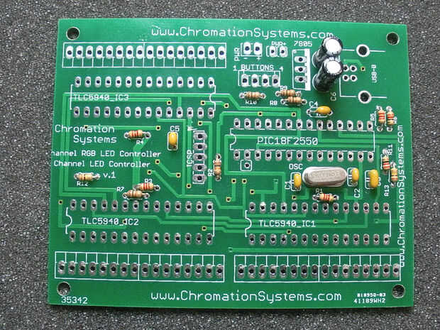 Puente/7805: Hay una posición para un regulador de voltaje 7805, que opcionalmente se puede instalar, pero no utilizado en la mayoría de los casos. El circuito lógico requiere + 5v y el voltaje del LED puede ser 3, 3V a 17v. Si por ejemplo, 3 LEDs en serie están siendo controlados por el canal, un + 12v puede usarse para la entrada de controlador y LEDs, y el 7805 debe ser instalado. Si se utilizan 5mm RGB LED de ánodo común + 5v que fuente de alimentación debe usarse y el 7805 debe instalarse, pero tienen que conectar en su lugar. (como en la imagen) Si el voltaje de la fuente es superior a 5v el 7805 necesita ser instalado, pero no trate de usar el 7805 para regular el voltaje del LED como rápidamente se quemaría.