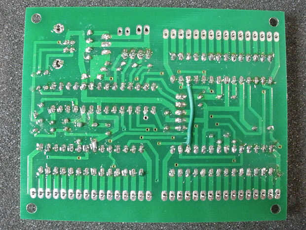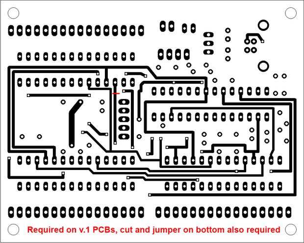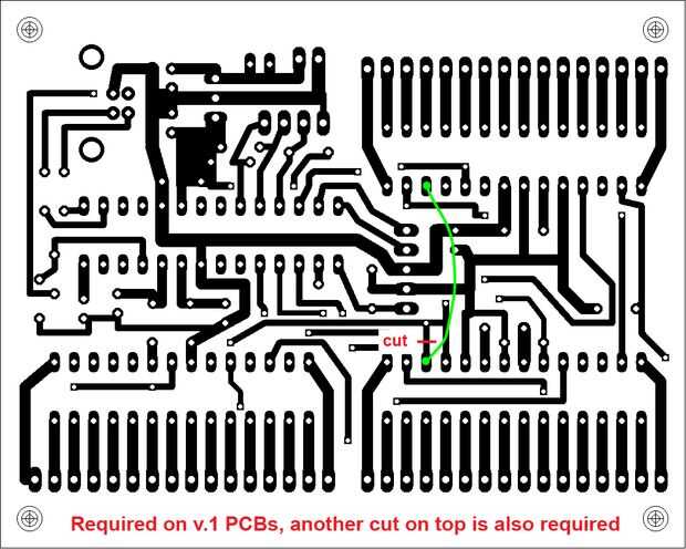 Debido a un lamentable error de la versión que 1 PCB requiere cortar un rastreo superior e inferior y un cable de puente instalado. Los PCB son enviados con los cortes necesarios ya hecho y comprobado. Si no está instalado este puente va a funcionar los primeros 32 canales pero no lo el pasado 16.