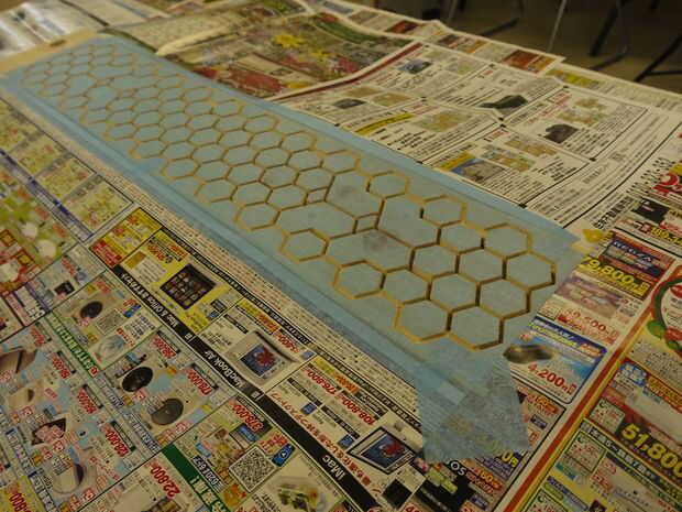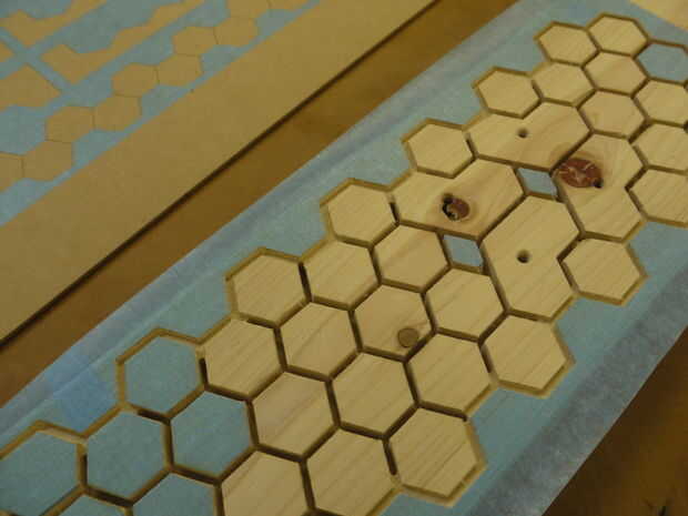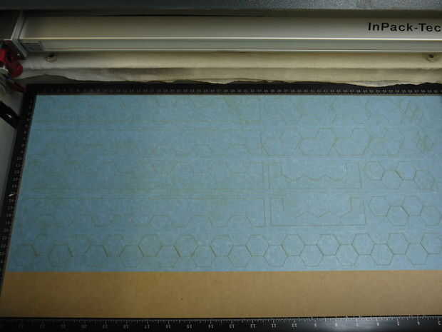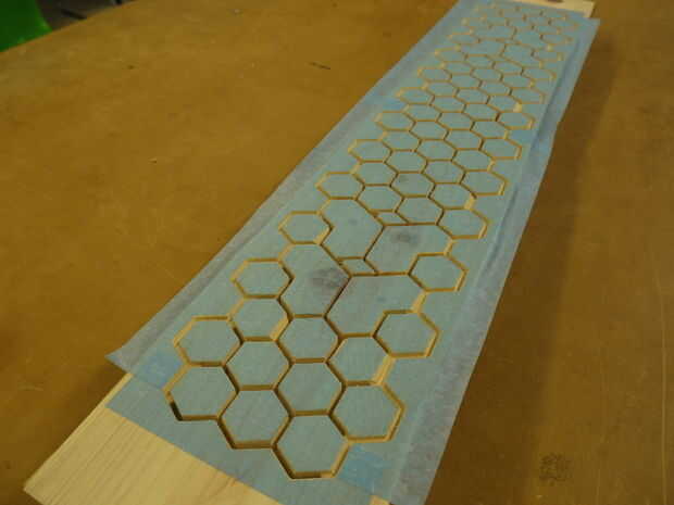 Cubrir un tablero MDF (300 mm x 600 mm) con cinta de enmascarar (mina era de 50mm de ancho) en un tablero MDF (300 mm x 600 mm) como 5 líneas horizontalmente. Y corte patrón (la hoja de corte está disponible abajo, llamado "masking_parts.pdf") de él con el cortador del laser.