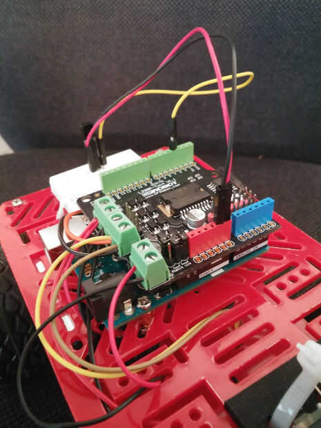 He debido motori latareli sinistri (guardando il Robot dalla parte del IR del sensore), vanno collegati sulla scheda motori (2A Motor escudo doble L298P V1.1 DFROBOT) riconosciuto nei pin M1 + e M1-, mentre i motori di destra vanno collegati sui pasador M2 + e M1-, infine il piedino hacia fuera del sensore IR è collegato pin 3 della scheda motori.