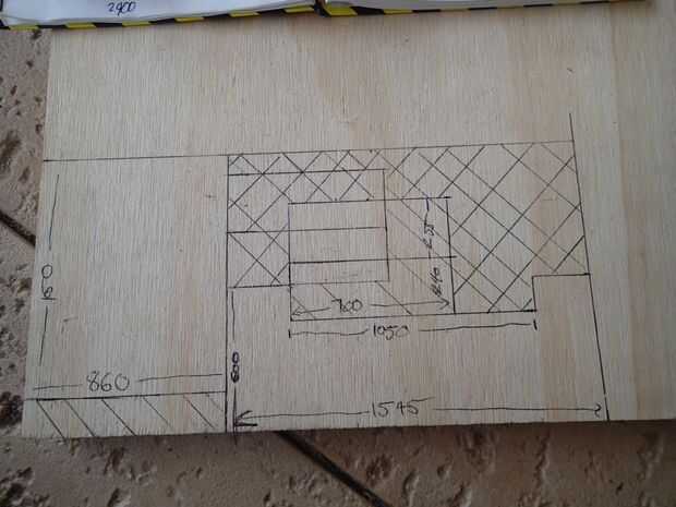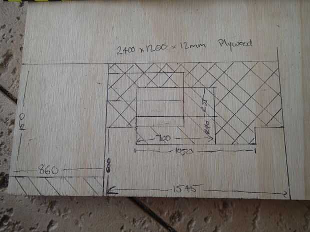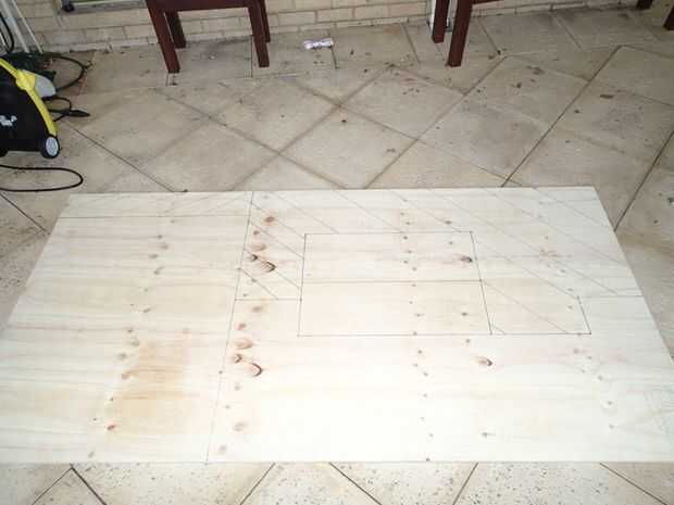 En primer lugar, hacer un plan a escala y luego añadir que escala su madera de tamaño real. Mis planes para la parte superior de madera contrachapada son tener varias secciones que son cubiertas individualmente con la alfombra Marina. Esto asegura que si una sección está dañada o desgastada hacia fuera puede ser reemplazado fácilmente.