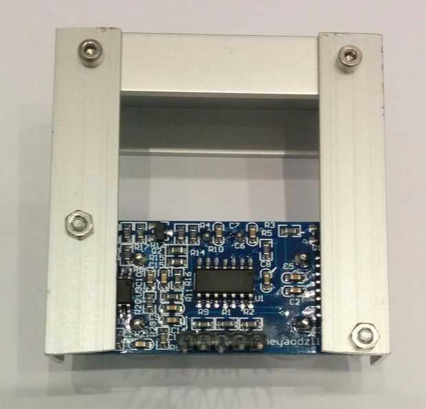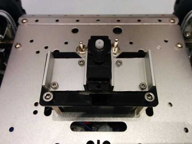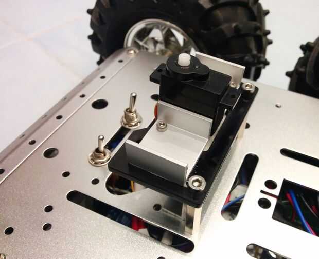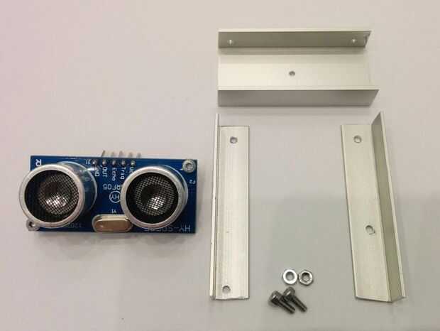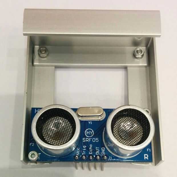 Para rotar el sensor se puede utilizar un micro servo. Servo puede acoplarse al chasis del robot utilizando piezas de aluminio en forma de U o L. originalmente, he hecho de la vivienda para el sensor de ultrasonidos SRF05 de un trozo de plástico rojo pero finalmente he cambiado al aluminio que es mucho más duradero.